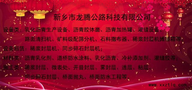 新鄉(xiāng)市龍騰公路科技有限公司 專注從事公路化學(xué)品的研發(fā)生產(chǎn)、道路建材的生產(chǎn)銷售 瀝青路面養(yǎng)護(hù)施工機(jī)械租賃,承接各類公路養(yǎng)護(hù)工程施工